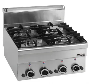 Gamme composée de 3 modèles top gaz avec 2, 4 ou 6 brûleurs. Structure et plan de travail en acier inoxydable. Boutons ergonomiques résistant à la chaleur. Le profil des panneaux de coté permet d'aligner et de joindre les appareils entre eux faisant qu'une seule pièces. Cheminée en acier inoxydable. Brûleurs de 2,7 kW et 3,1 kW. Robinet gaz avec sécurité par thermocouple permettant l'arrêt automatique de l'alimentation gaz.